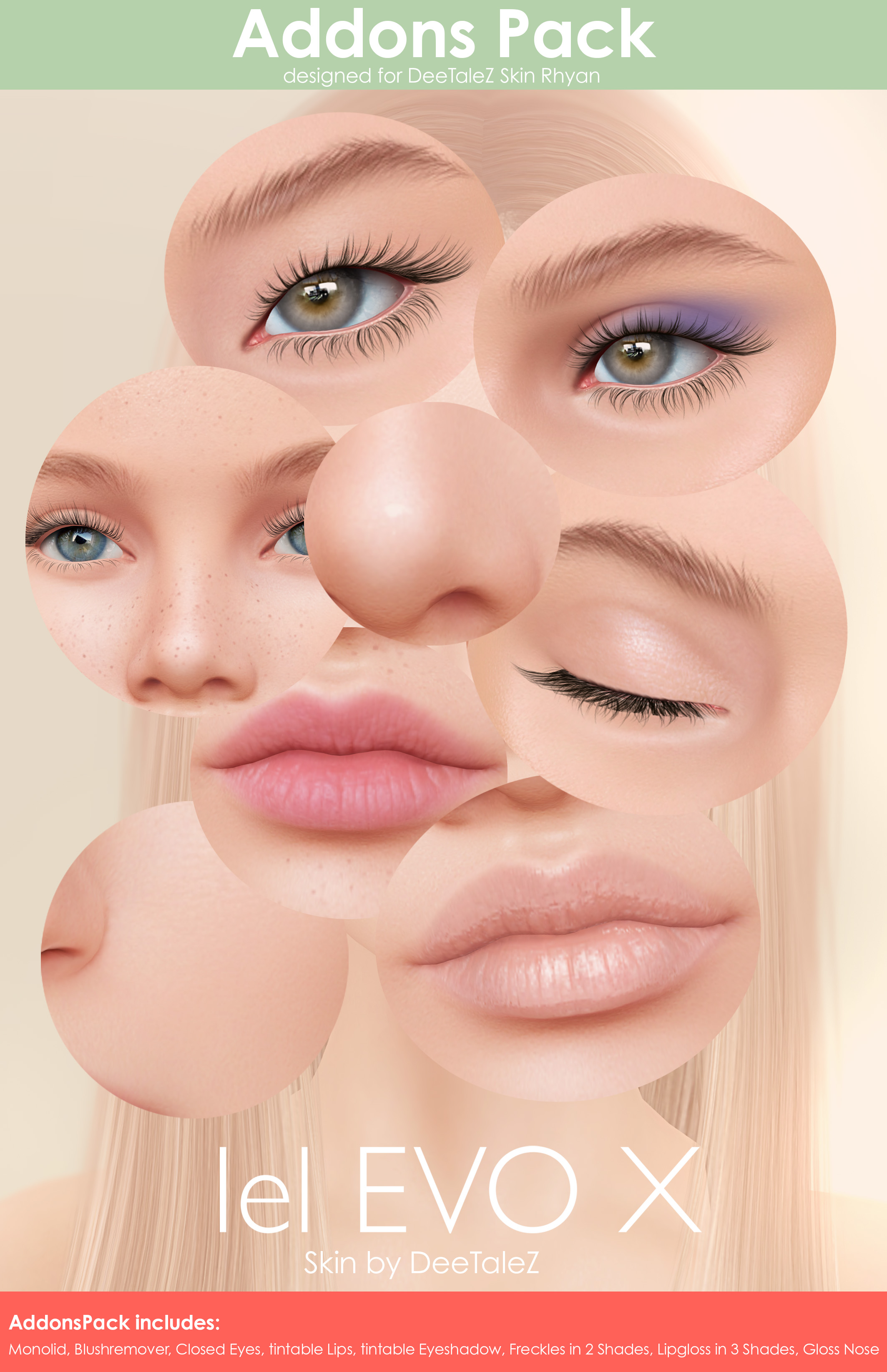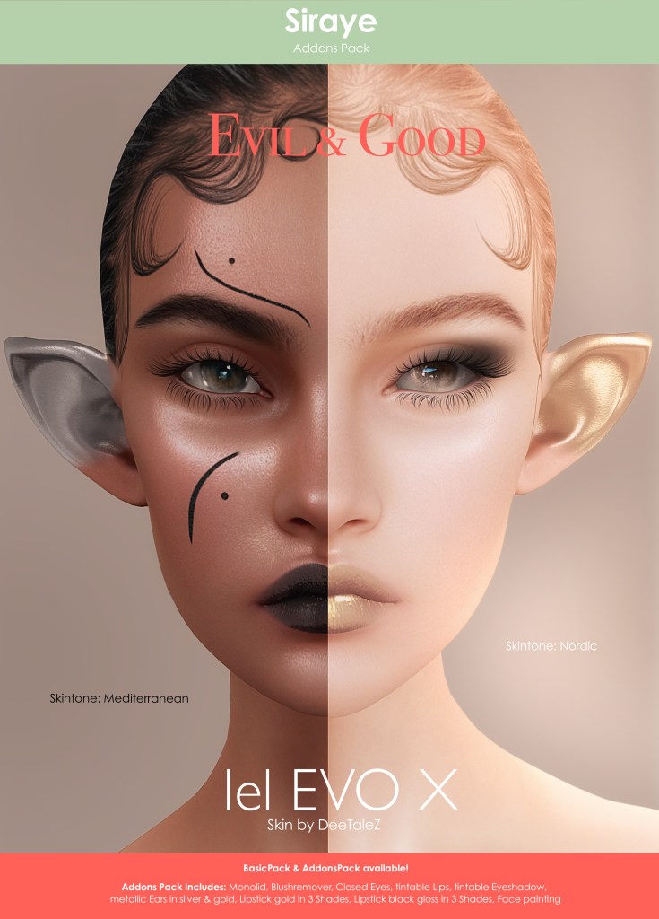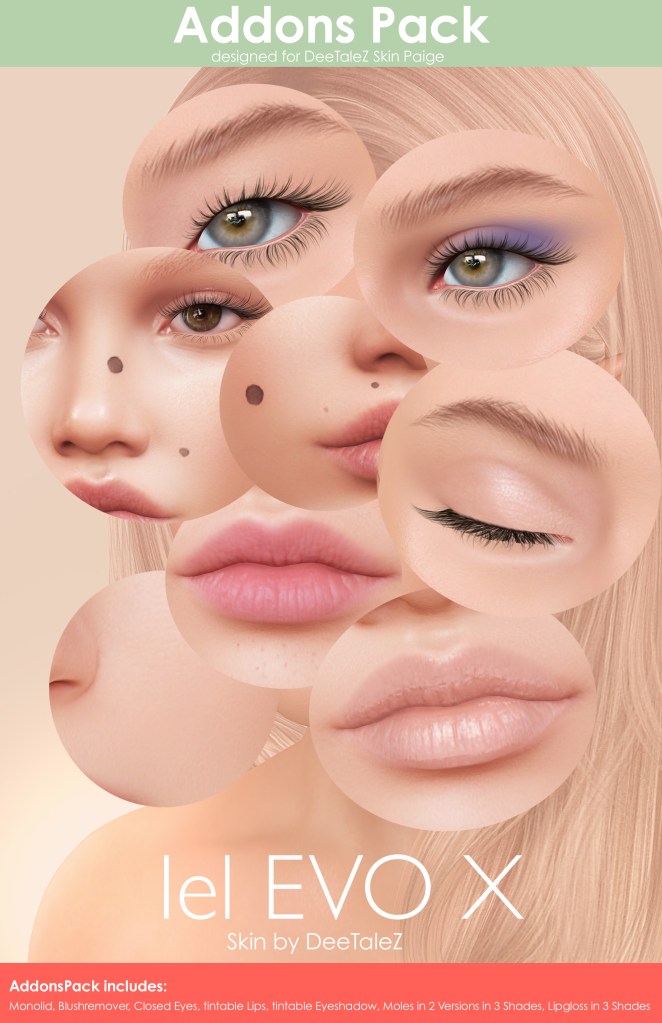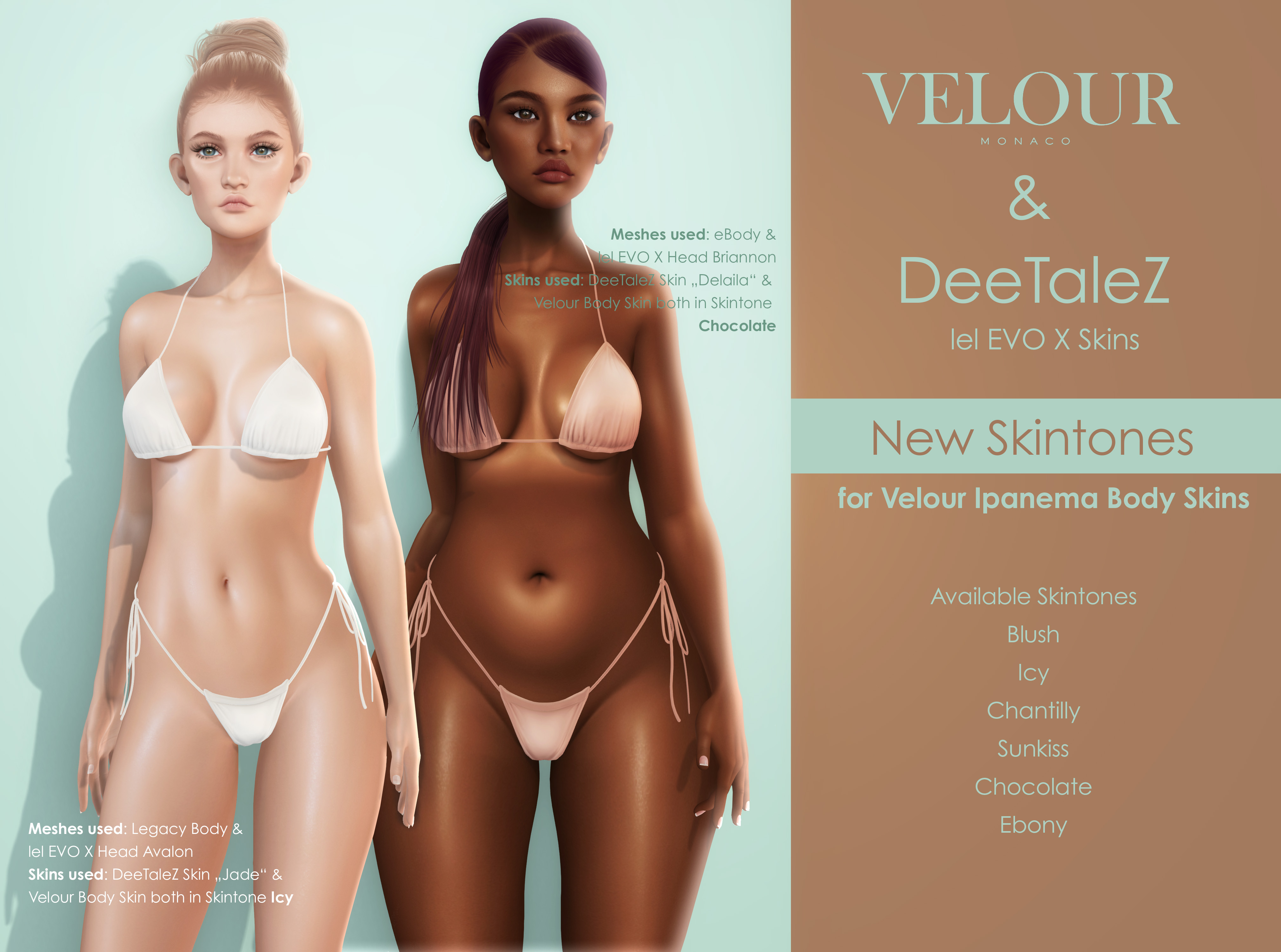 DeeTaleZ will have new skins from time to time in Velour Ipanema Body Skins. Available Skin tones are – Blush, Icy, Chantily, Sunkiss, Choclate, and Ebony.