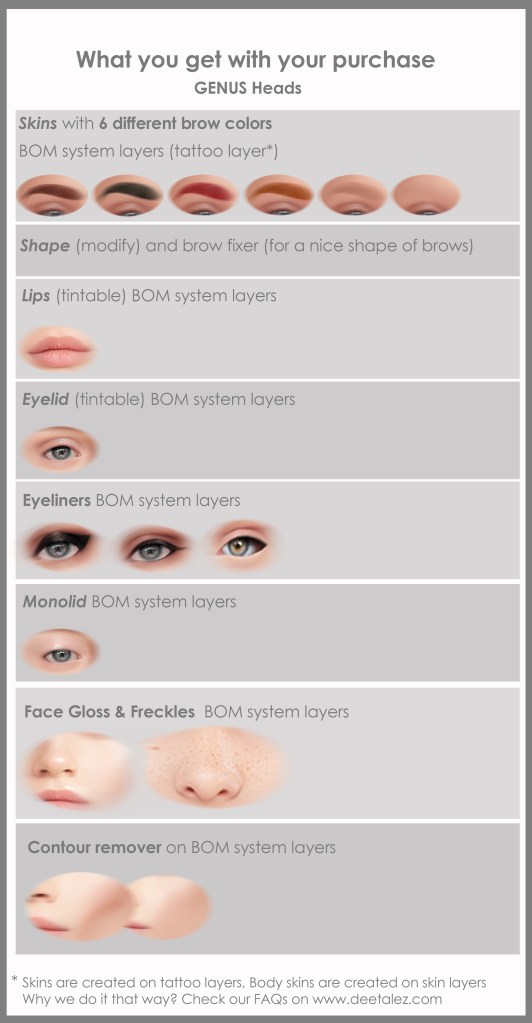 Skins from Feb 2020 – Sept 2021 are L$1299 (including all Skins + Addons/ Makeup on BOM layers.)