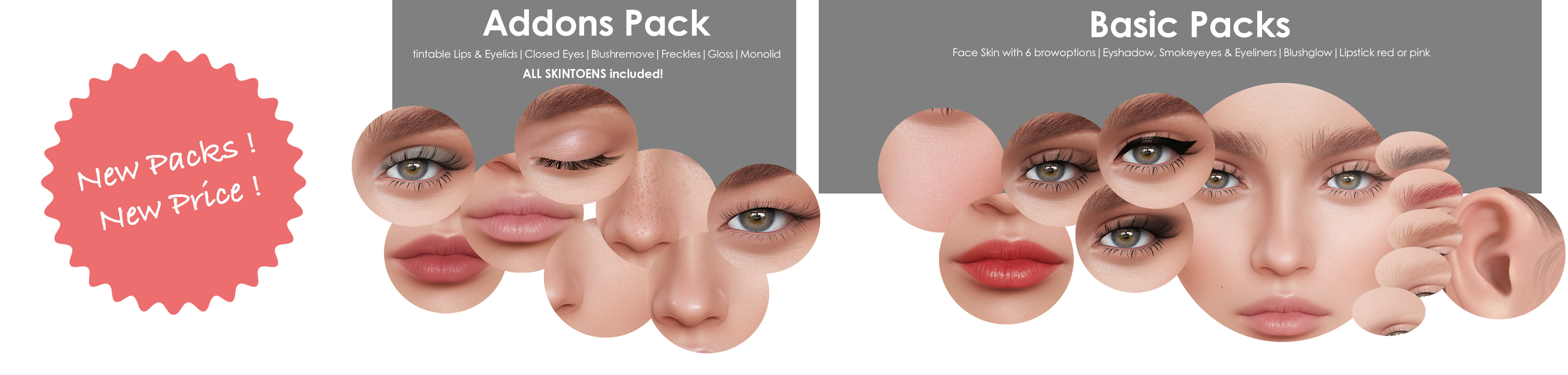 Basic Packs include all Skins + basic Makeups & Shape ADDONS Pack includes addons for that specific skin like Blush remover, Monolid, Closed Eyes, tintable Lips & Eyelid, Freckles, Gloss.